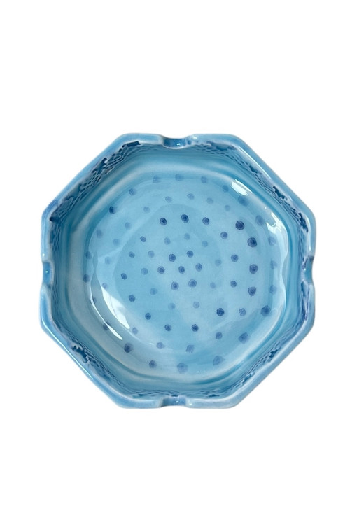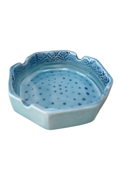 در لبه ی داخلی زیرسیگاری دستساز سرامیکی نقوشی حکاکی شده است که داری برجستگی و فرورفتگی هستند و داخل زیرسیگاری خالدار است که این خال ها نقاشی شده هستند و به زیبایی کار افزوده شدن. لعاب کار شده آبی فیروزه ای می باشد که زینت بخش منازل و محیط کار شماست.